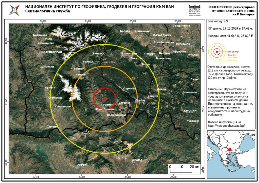 По данни на Националния сеизмологичен център към Национален институт по геофизика, геодезия и география – БАН, събитието от 29 декември 2024 г., от 17:42 часа българско време е с епицентър на 30 км от град Доспат, на 50 км от град Кресна и на 120 км от град София.