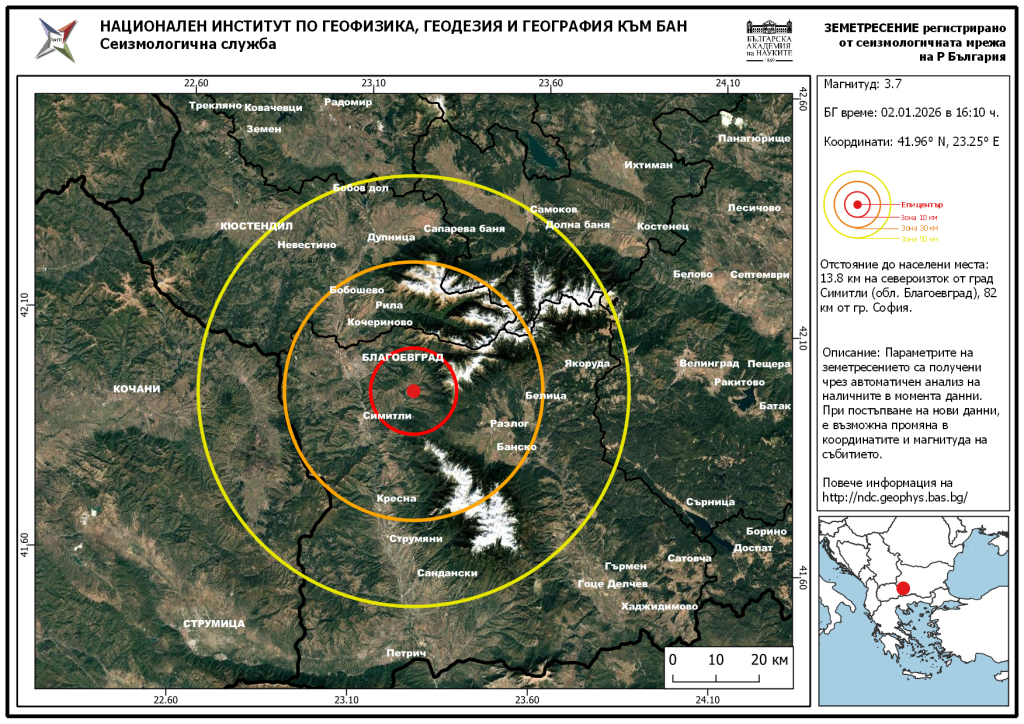 По данни на Национален институт по геофизика, геодезия и география, епицентърът на земетресението е бил в близост до границата със Северна Македония, на дълбочина около 15 километра.