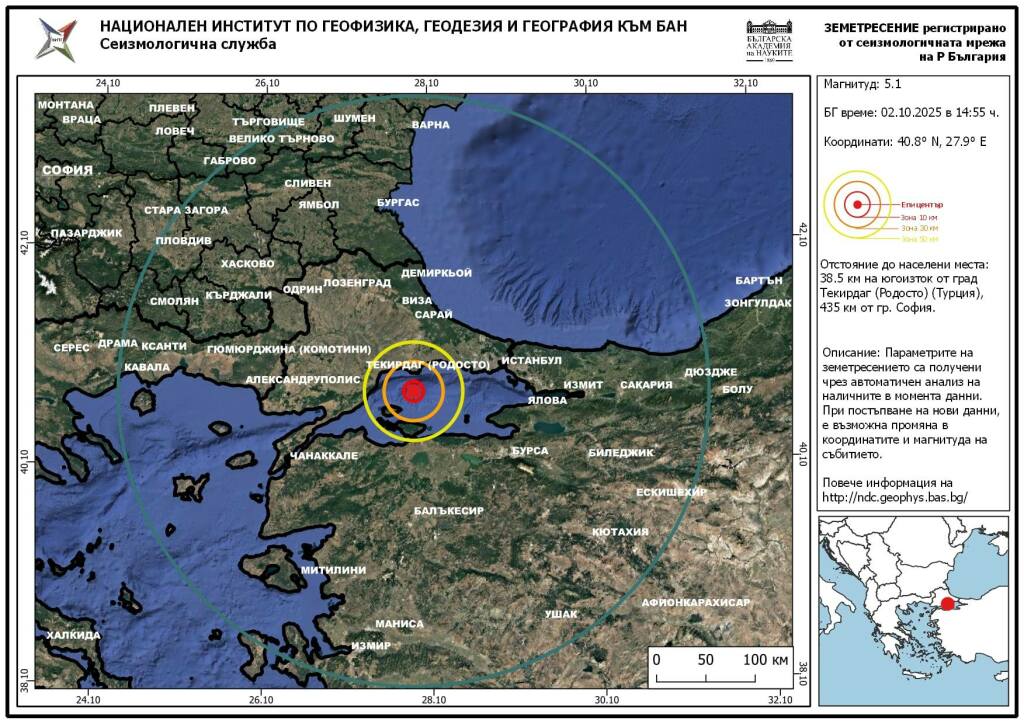 Земетресение с магнитуд М=5.1 е регистрирано в района на Мраморно море, Турция.