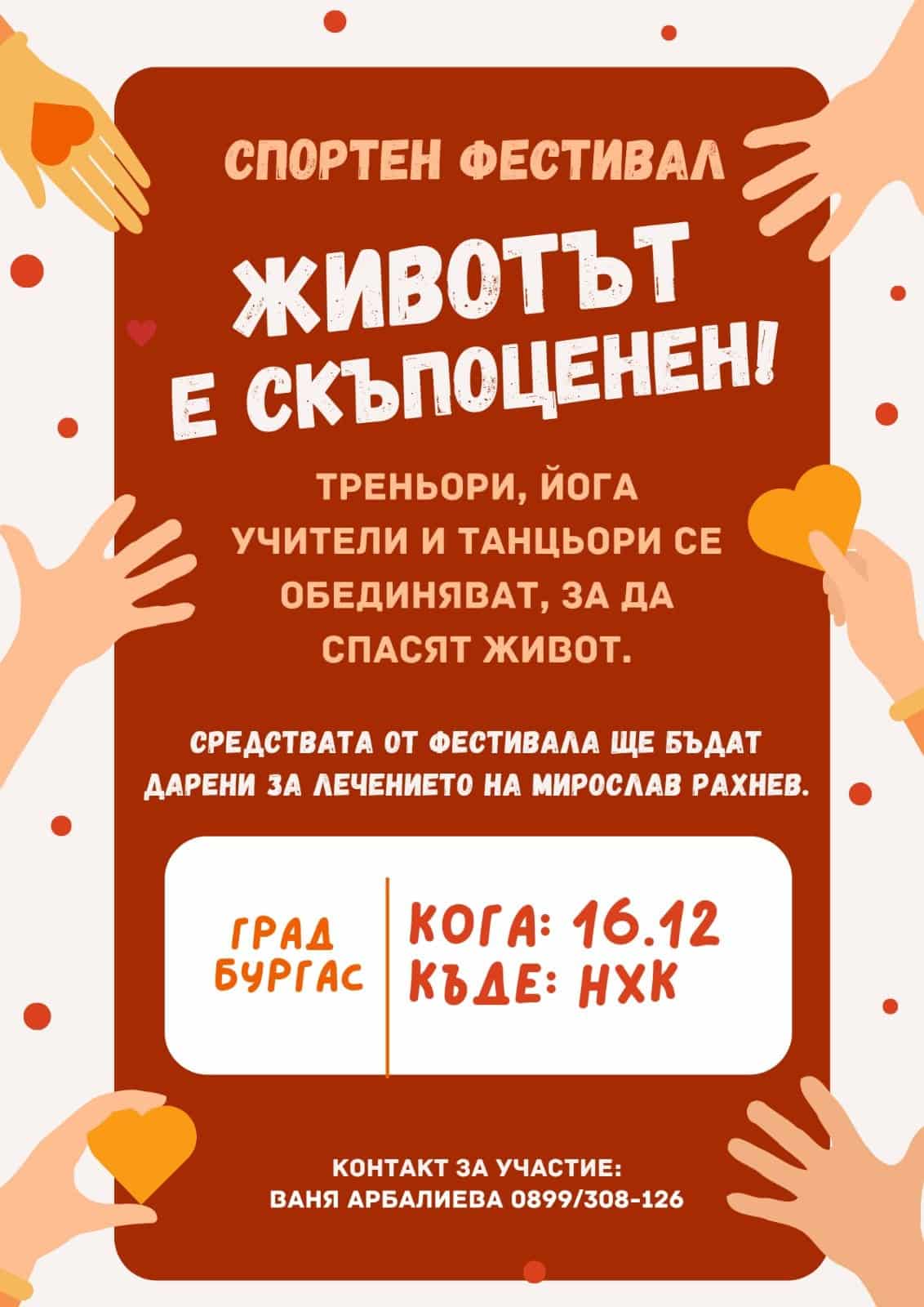 В помощ на Мирослав Рахнев да пребори коварното заболяване се обединиха треньори, йога учители и танцьори от Бургас. Организатор на Спортния фестивал е Ваня Арбалиева.
