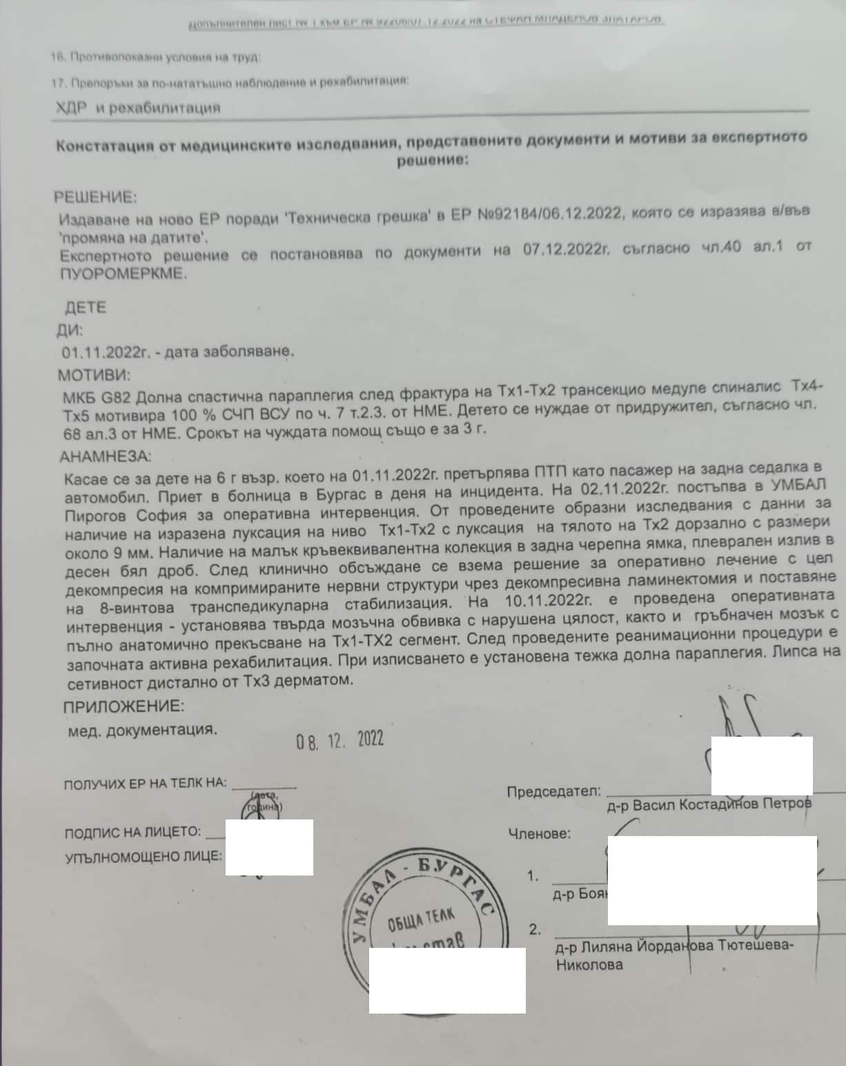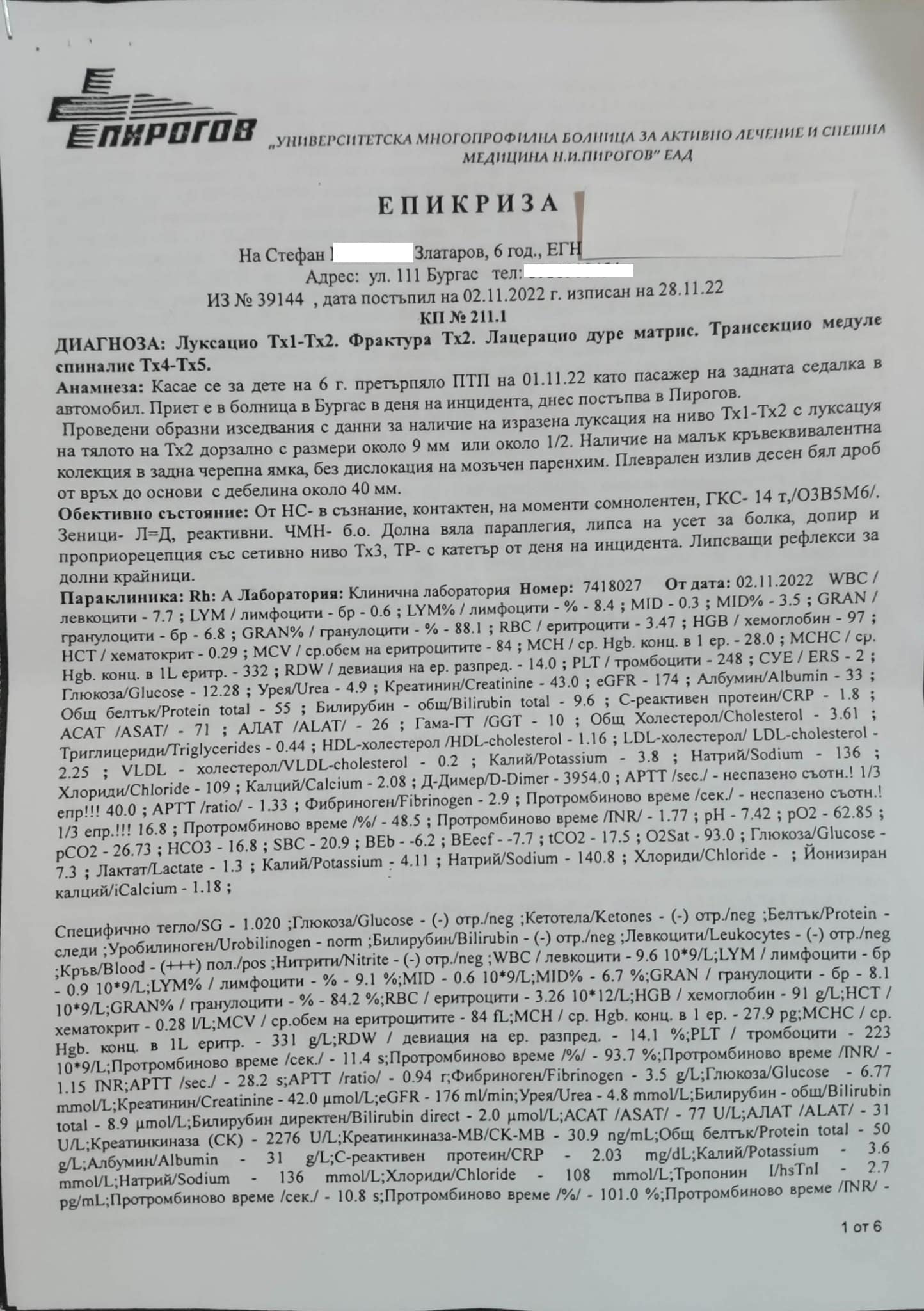 Детето има нужда от помощ, за да проходи и да влезе здрав в първи клас. От документите за състоянието на момченцето става ясно, че той е пострадал по време на катастрофа, като е бил на задната седалка. Първоначално е бил приет в болница в Бургас, след което е бил приет за лечение в „Пирогов“. Неговите близки призовах в социалните мрежи:
