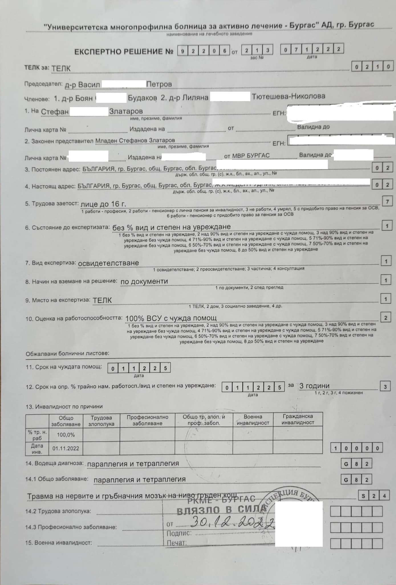 Вече са поръчани специални протези за крачетата, които да държат ставите изправени и да се избегнат контрактури и усложнения, които са на стойност 1300 лв. Необходимо е да се поръчат още два вида протези, с които той да може да бъде изправян поетапно, които възлизат на стойност над 30 хил. лева.“