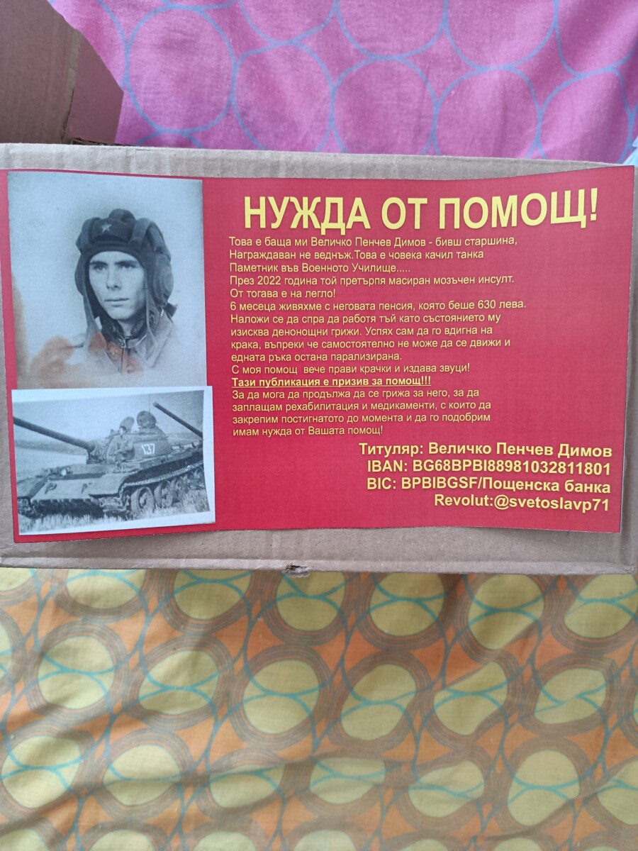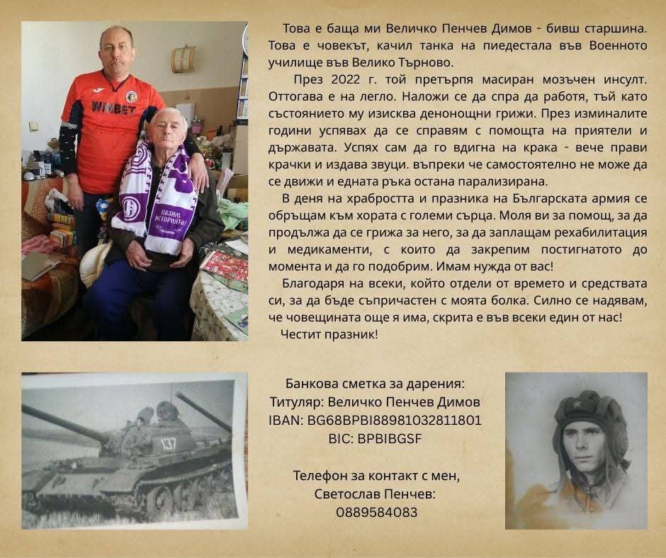 Величко Димов е бивш старшина. Преди 4 години той претърпява тежък инсулт. Изписан е след 6 дни безжизнен. Има решение от ТЕЛК, като за него в момента се грижи синът му.