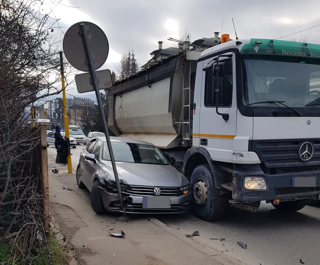 Ударили са се „Фолксваген“ и тежкотоварен автомобил. Колата се е качила на тротоара и се е забила в пътен знак.