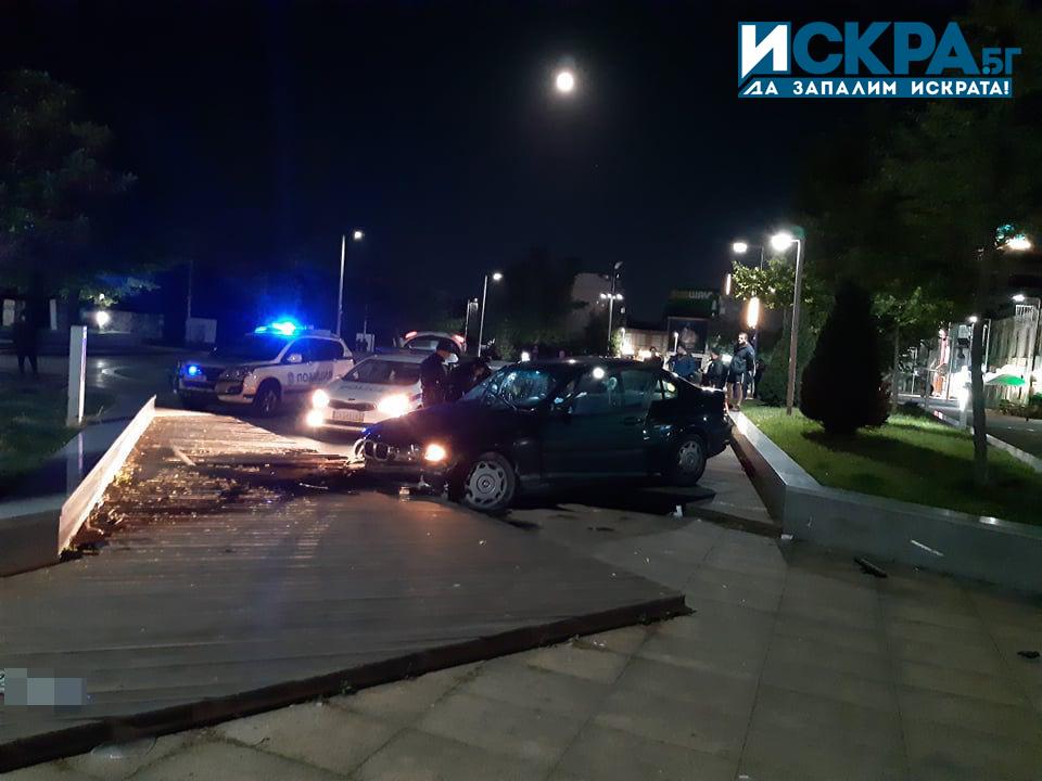 Автомобил „BMW“ се е блъснал в дървената конструкция на площад „Тройката“ в Бургас, твърдят свидетели. Злополуката е станала след преследване с полицията малко преди 00:00 часа. Колата буквално се е заклещила между дървените рампи и по този начин е била застигната от полицията.