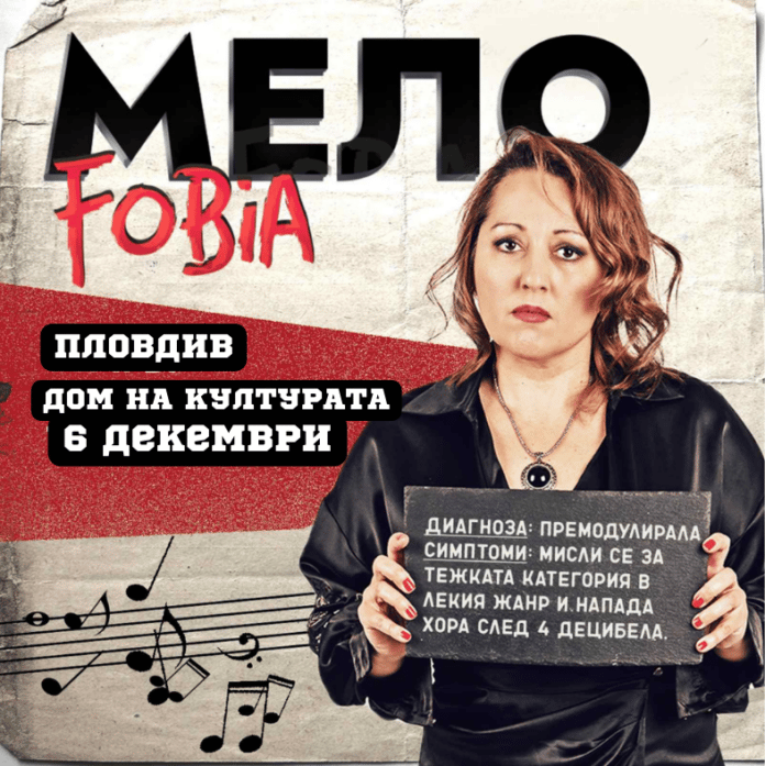 Звездни актьори и музиканти ще представят „Мелофобия“ в Пловдив, съобщиха от общината. „Ще се смеете и ще пеете!“, твърдят участниците в комедията – Милица Гладнишка, Милена Маркова-Маца, Иван Велчев, Николай Воденичаров – Никеца и Мирослав Иванов на 6 декември в Дом на културата „Борис Христов“ – Пловдив от 19:00 часа.